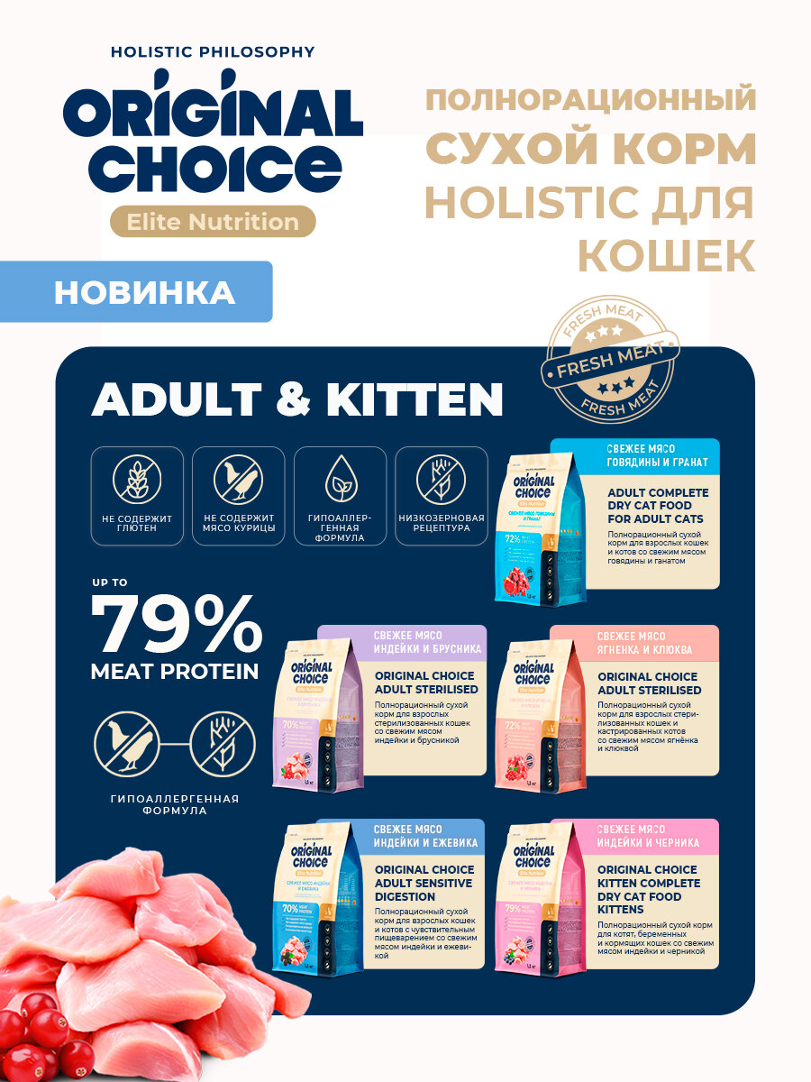 Суперпремиум формула включает:- Умеренное содержание белка (27% от сухого вещества) — курица как основной источник