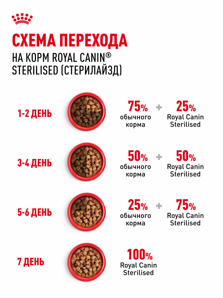 - Дни 1-2: смесь 75% старого корма + 25% Royal Canin