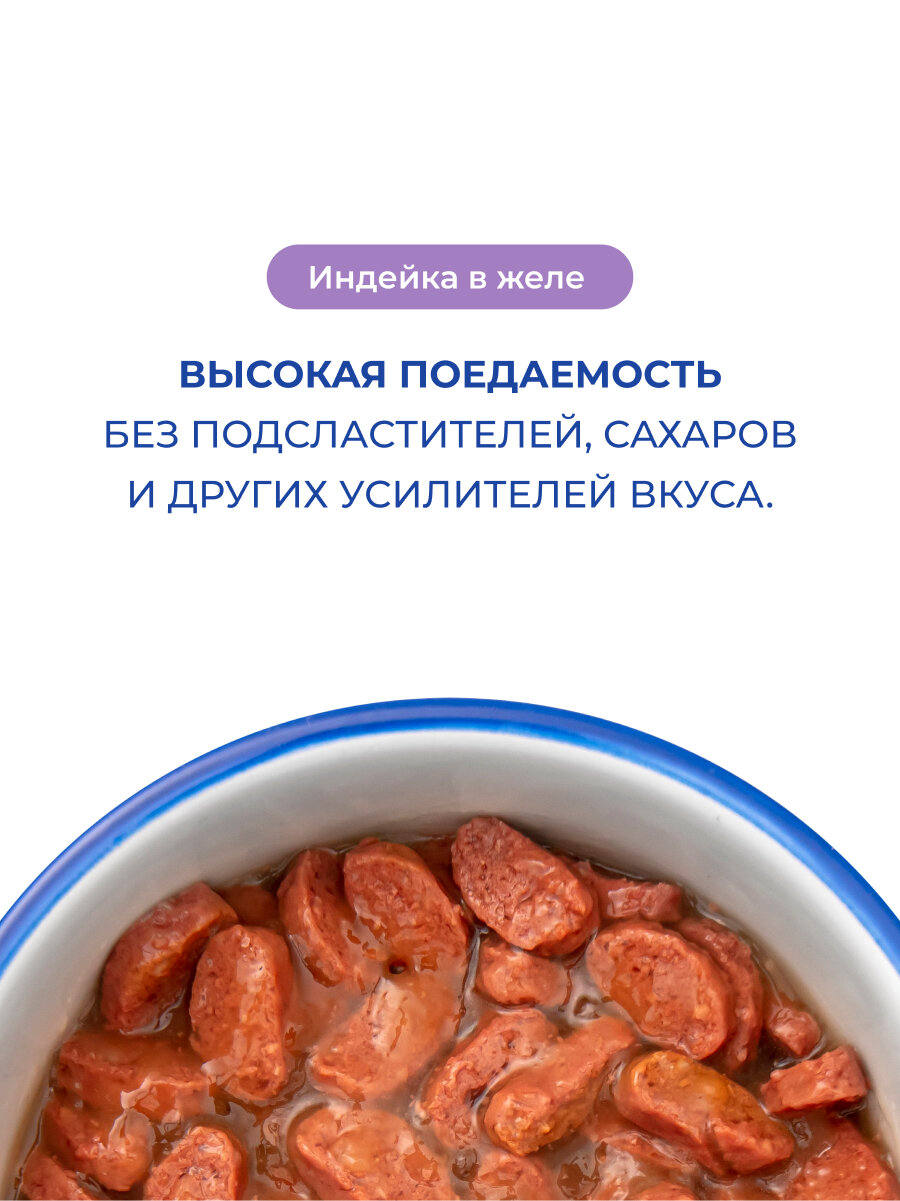 | Индейка (65%) | 13 г белка/пауч | Гипоаллергенный протеин |