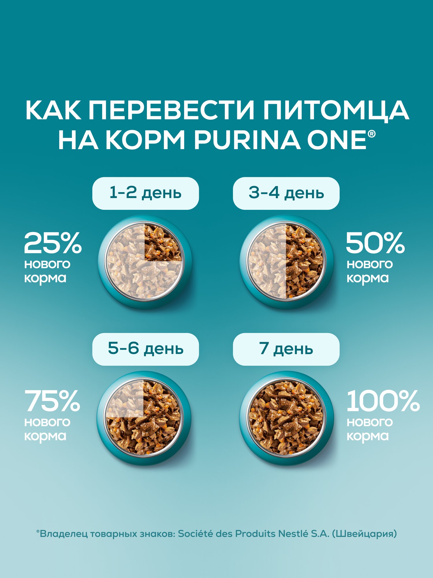 - Дни 1-2: 25% Purina One + 75% старого корма