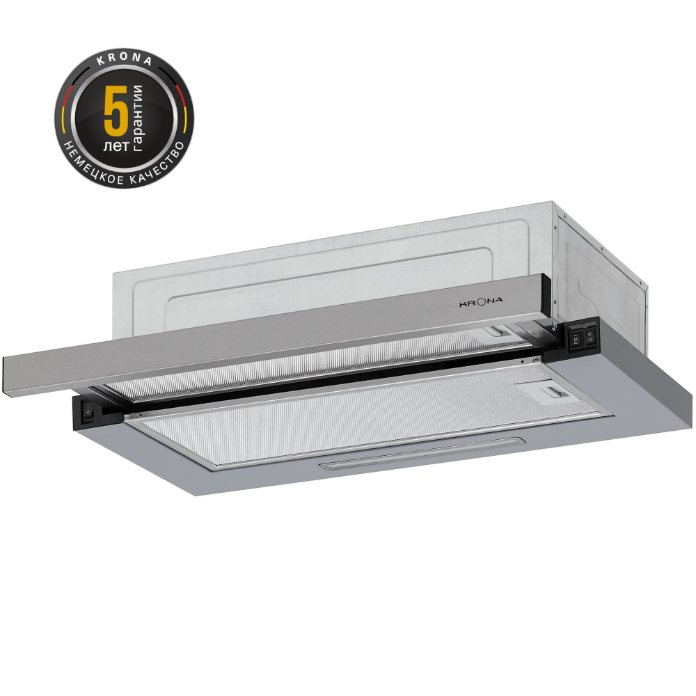 Встраиваемая вытяжка Krona Kerry E 600 шириной 60 см спроектирована для интеграции в стандартные кухонные гарнитуры. Производительность модели составляет 510 м³/час, что позволяет быстро удалять запахи и испарения с площади до 20 м². В отличие от сенсорных аналогов, здесь используется механическое управление с тремя скоростными режимами – такое решение увеличивает срок службы до 10 лет по данным испытаний ГОСТ Р 51317.99.