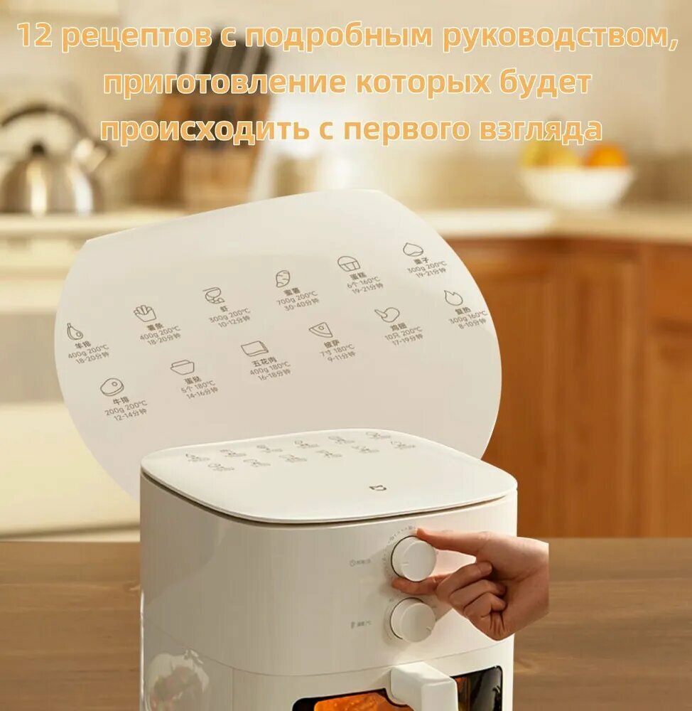 Механический таймер и регулятор температуры делают управление аэрогрилем интуитивным даже без знания китайского языка. Вместо сенсорного экрана здесь используются: