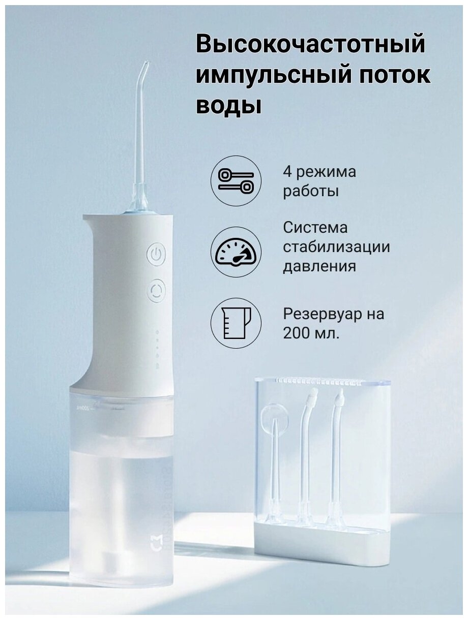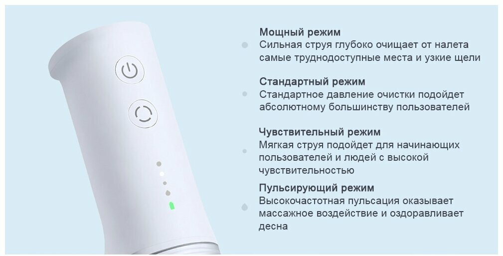 Ирригатор Xiaomi Mijia MEO701 генерирует микропузырьковую струю с регулируемым давлением от 137 до 960 кПа. Пульсирующая технология создаёт 1400 импульсов/минуту, что на 23% эффективнее удаляет зубной налёт по сравнению с линейными моделями. Система использует 4 режима очистки: Стандарт (для ежедневного применения), Мягкий (при чувствительных дёснах), Мощный (при брекетах) и Массаж (для улучшения кровообращения).