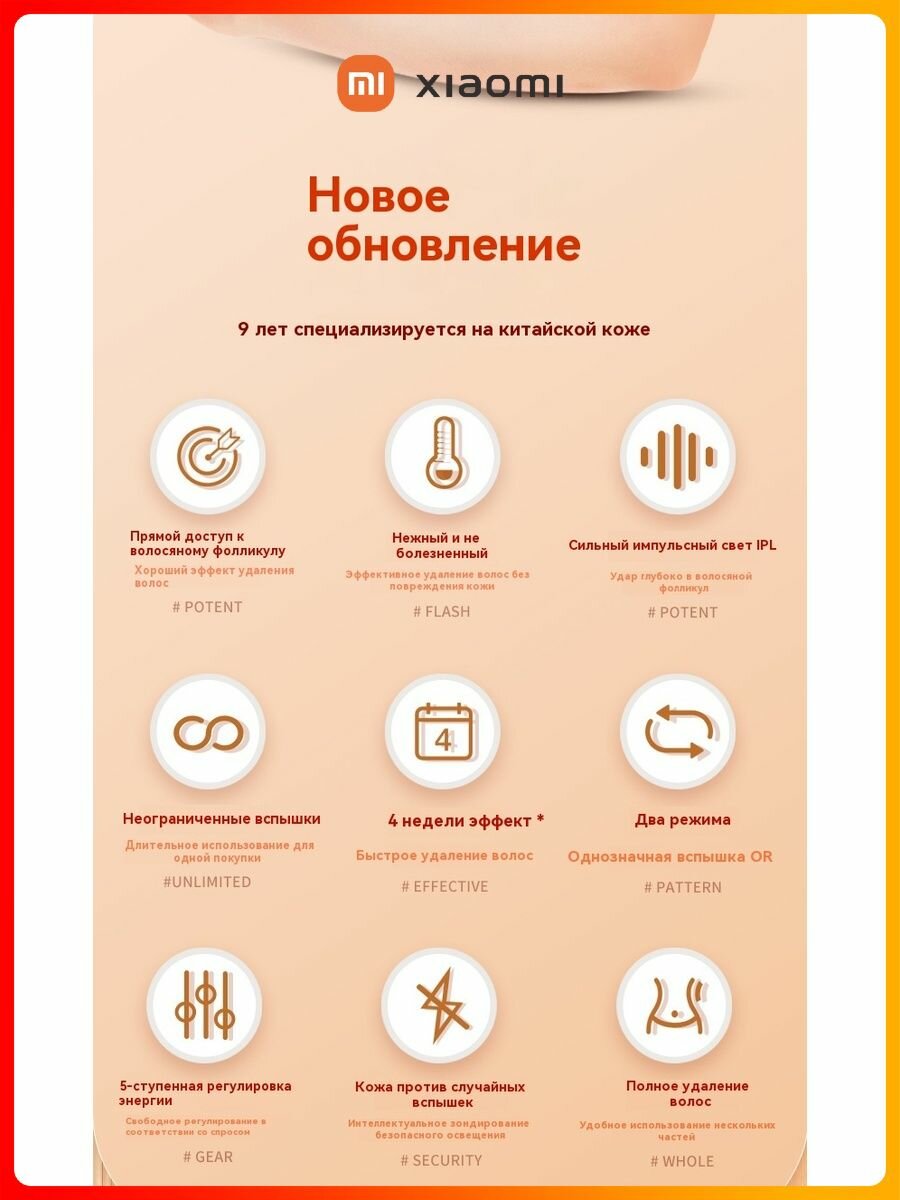 Боль и дискомфорт: Встроенная система охлаждения снижает болезненность до 2/10 баллов против 4-7 у профессиональных аппаратов. Риск ожогов контролируется датчиком контакта с кожей - вспышка срабатывает только при полном прилегании насадки.