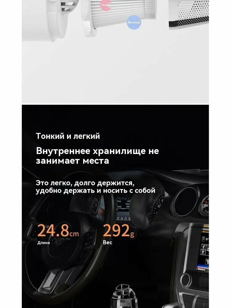 Циклонный фильтр объёмом 0.13 литра оптимизирован для ежедневного использования в авто — большинству пользователей хватает 3-4 уборок между очистками контейнера. Инженерам удалось решить проблему застревания мелкого мусора благодаря съёмной конструкции с отсеком для крупных частиц. Пылесос поддерживает только сухую уборку, но справляется с песком, шерстью животных и пищевыми крошками.