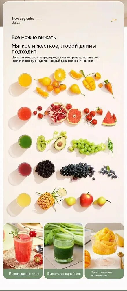 Комбинированная система Xiaomi ZHAZHIJI использует два метода отжима: роторно-центробежный механизм для сочных цитрусов и твёрдых овощей (4000 об/мин), горизонтальный шнек для листовой зелени и ягод (65 об/мин). Отличием от конкурентов вроде Kitfort KT-1111 выступает автоматическое переключение между режимами при изменении плотности продукта.