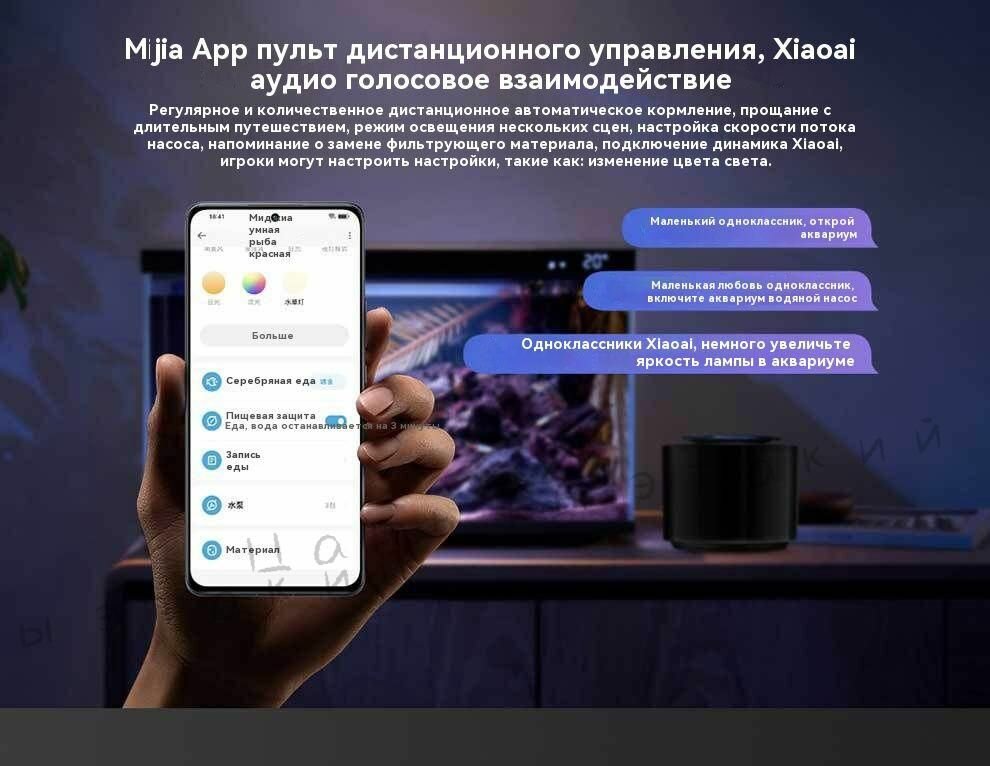 Аквариум Mijia Smart Fish Tank весом 8.8 кг создан для настольного размещения благодаря устойчивой прямоугольной форме габаритами 44.5×25.6×26.7 см. Встроенная система очистки 4в1 интегрирует: