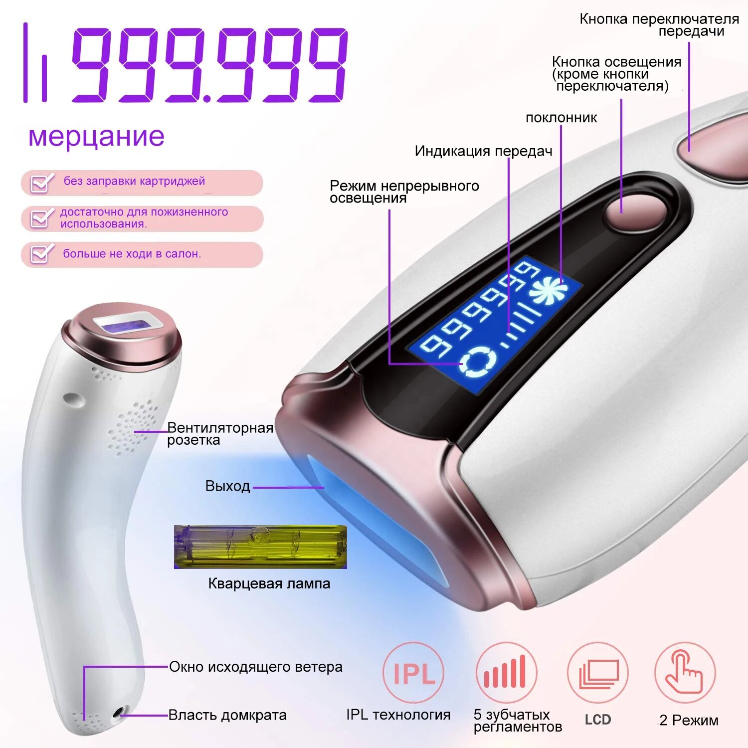 Лазерный эпилятор Xiaomi Youpin использует технологию IPL (Intense Pulsed Light), которая отличается от классических лазерных систем. Аппарат генерирует широкополосный световой импульс, воздействующий на меланин в волосяных фолликулах. Прибор подходит для обработки зоны бикини, подмышек и лица благодаря специальным насадкам в комплектации.